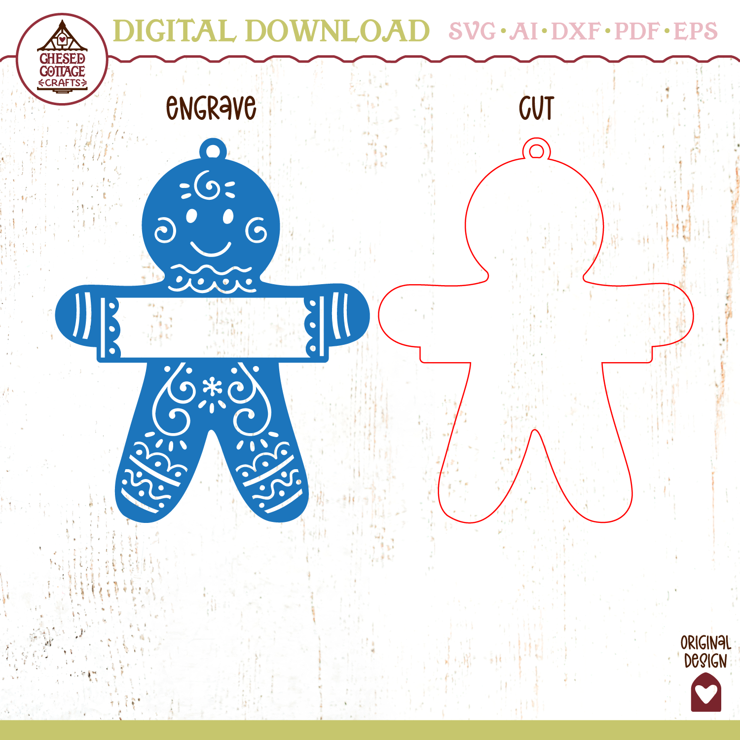 This Laser Gingerbread Man Ornament design is a digital download that contains high quality craft cut files that have been created to work for laser machines, like Glowforge or Xtool. This file has been tested on a Glowforge.