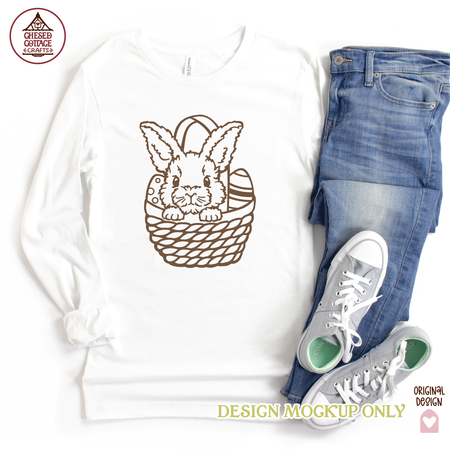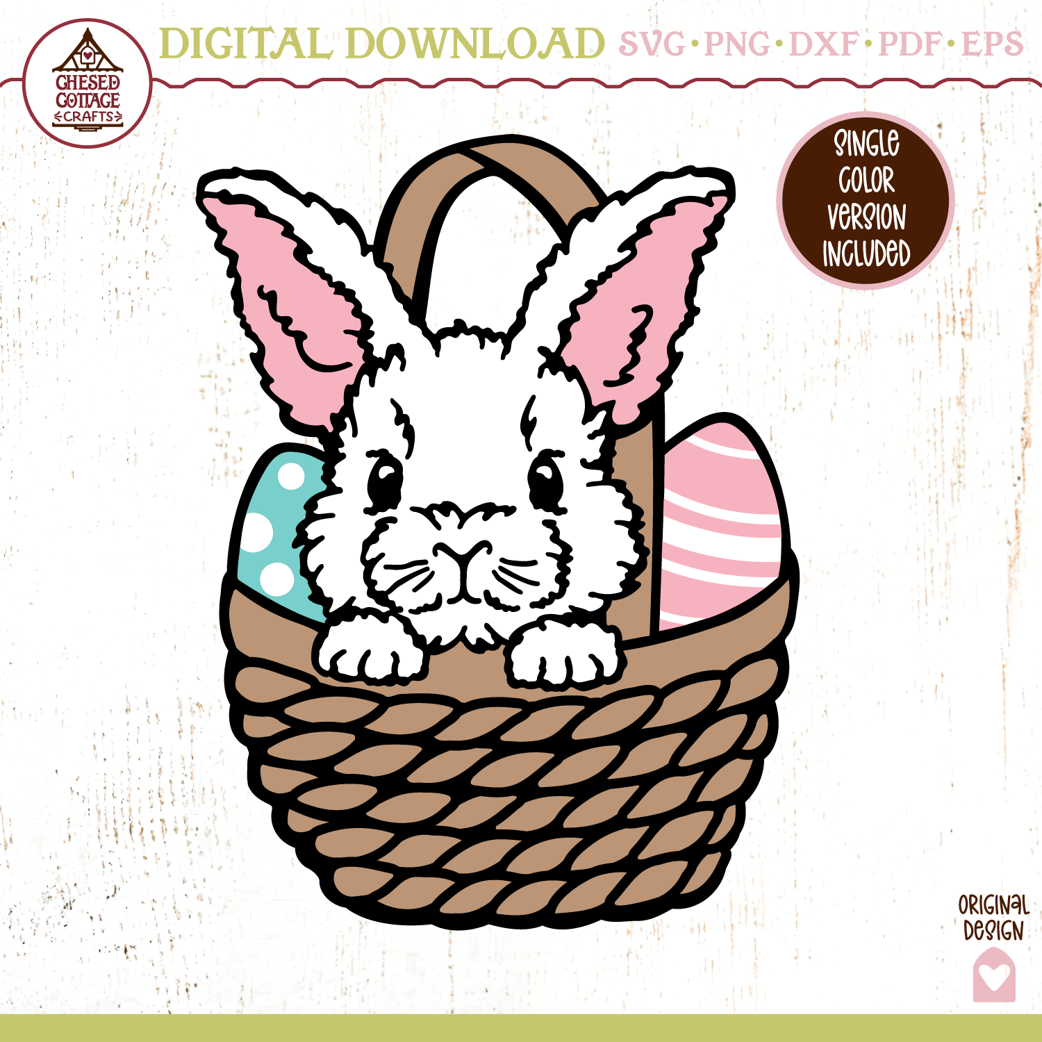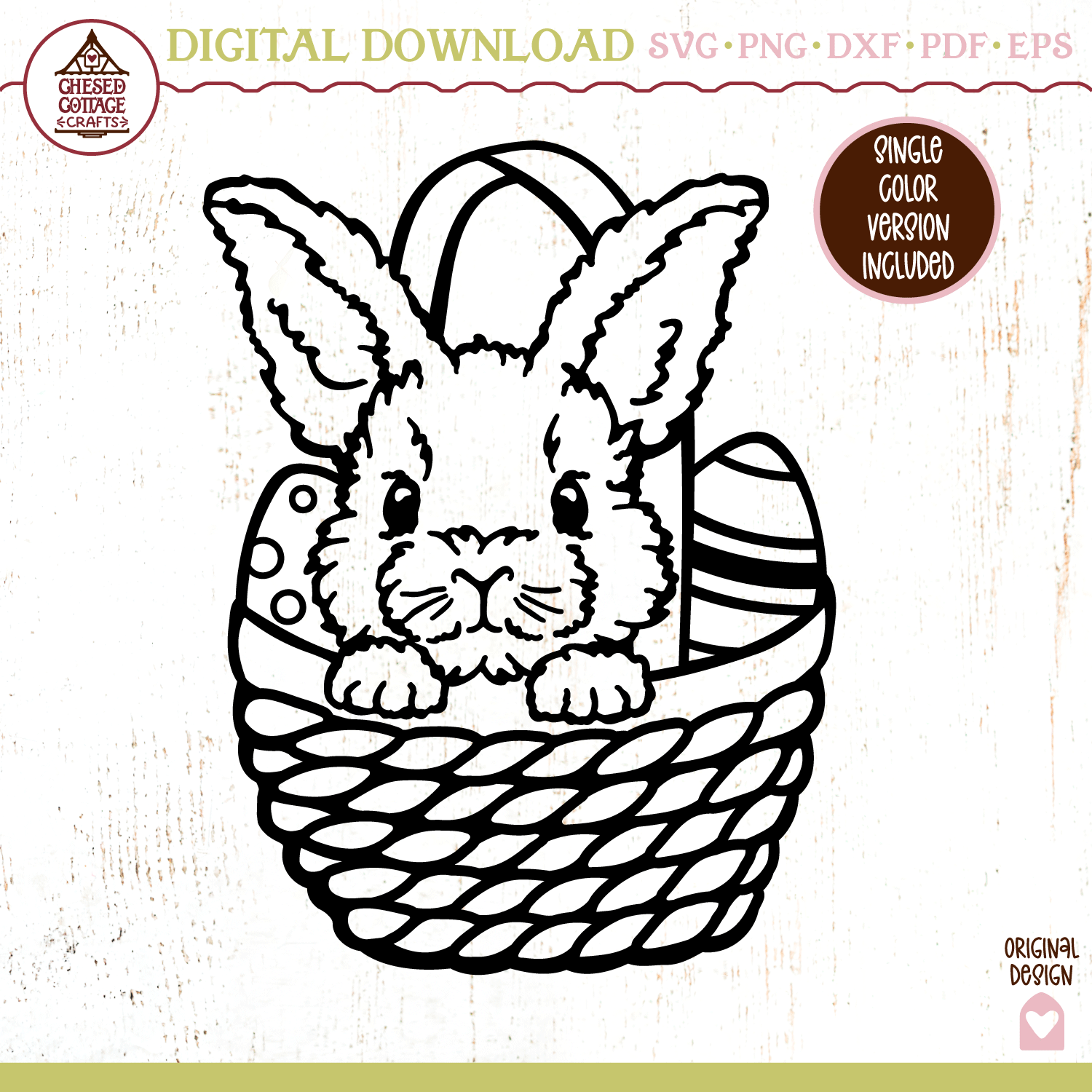 This Easter Bunny in Basket design is a digital download that contains high quality craft cut and print files that have been created to work for cutting machines, like Cricut and Silhouette and more.