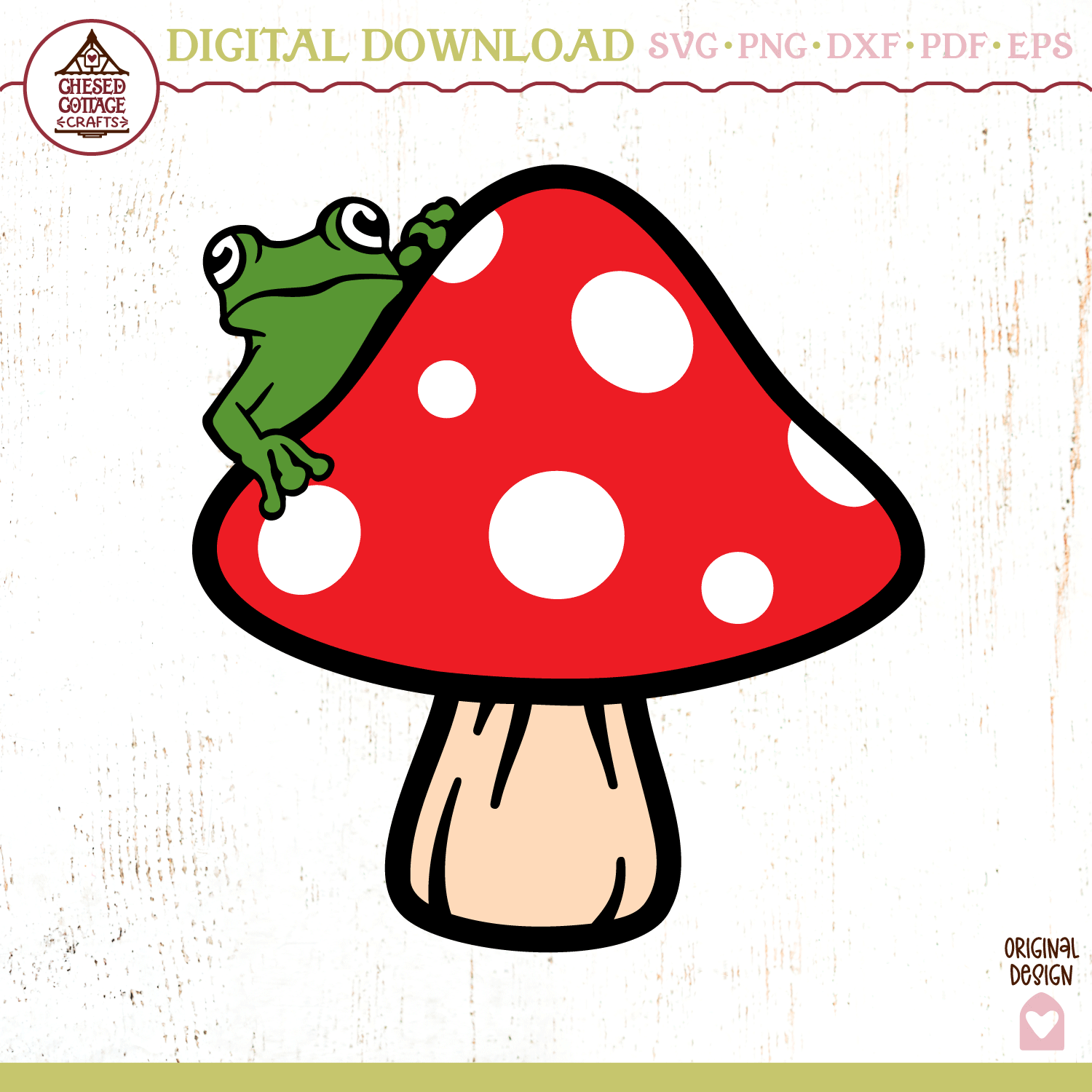 This cute frog mushroom design is a digital download that contains high quality craft cut and print files that have been created to work for cutting machines, like Cricut and Silhouette, sublimation printers, laser machines and more. Use this design for many types of projects for home decor items, apparel or your own inspired creation.