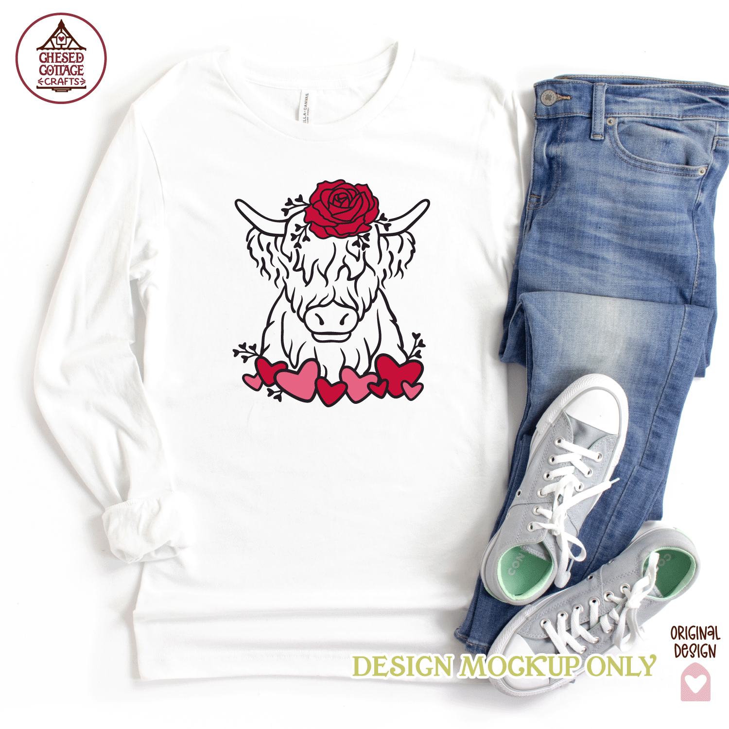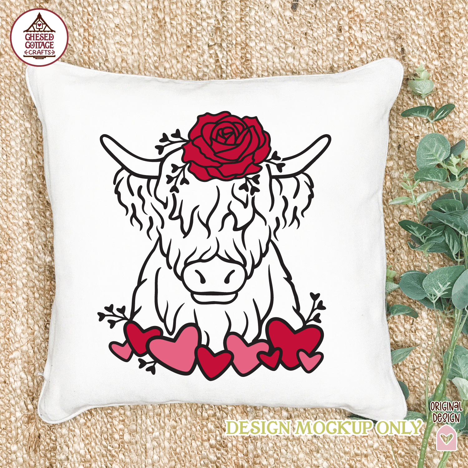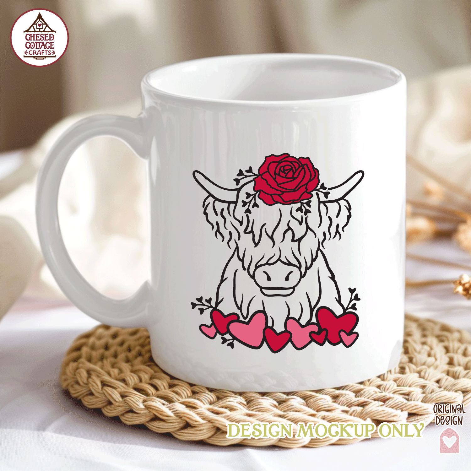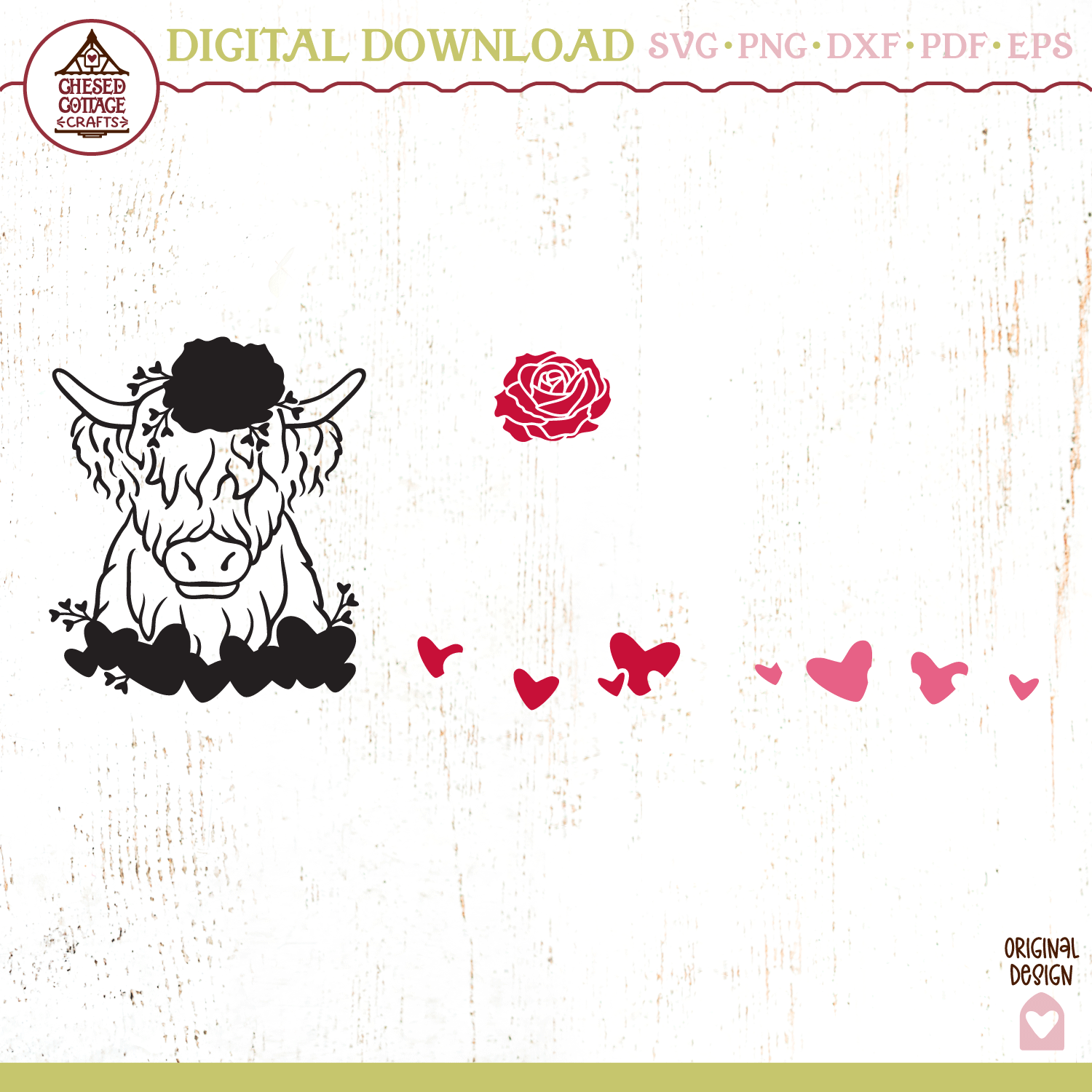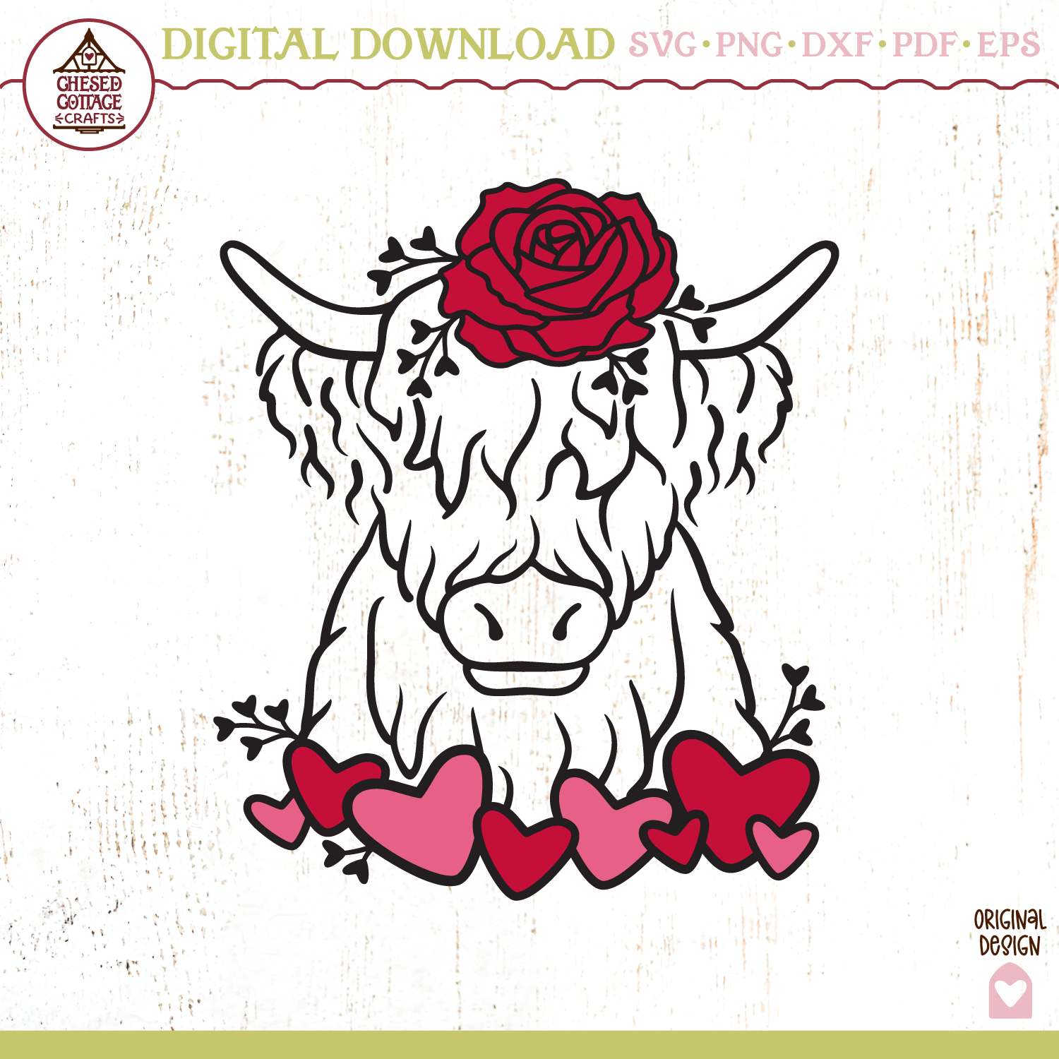 This Valentine floral highland cow design set is a digital download that contains high quality craft cut and print files that have been created to work for cutting machines, like Cricut and Silhouette and more.